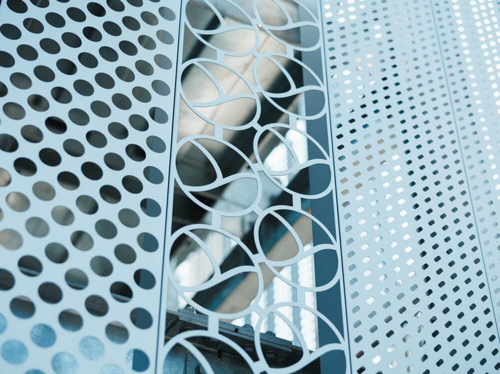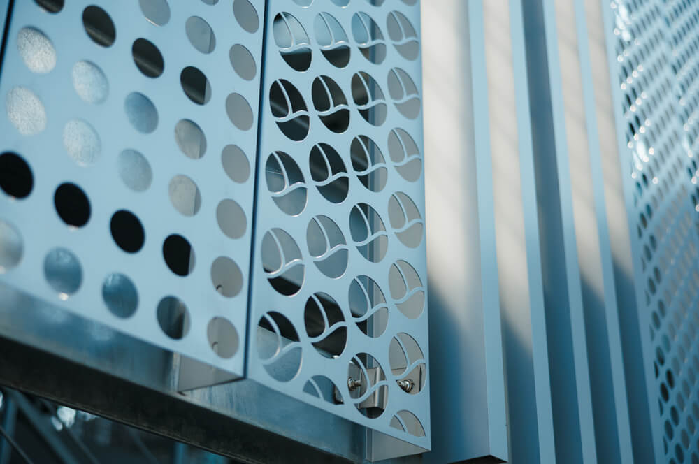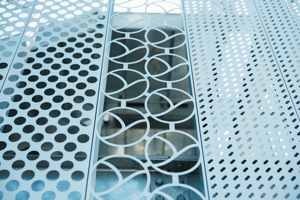 パンチングパネルとは穴の開いた金属板のことですが、これも消火活動の妨げにならないよう、外周全面を覆うことができないことや、穴の有孔面積についてもパネル全体に対しての一定の開口率が確保されていないと認可されません。そんな消防法上のルールもあり、デザインの制限がかなりありましたが、現在完成したものは、パネルの開口率を計算した上でデザインしたもので、さらにそのデザインも自由にできることから、所々に島根電工のロゴマークを忍ばせてみたりと、ルールを飛び越えない程度に遊び心もプラスしてあります。