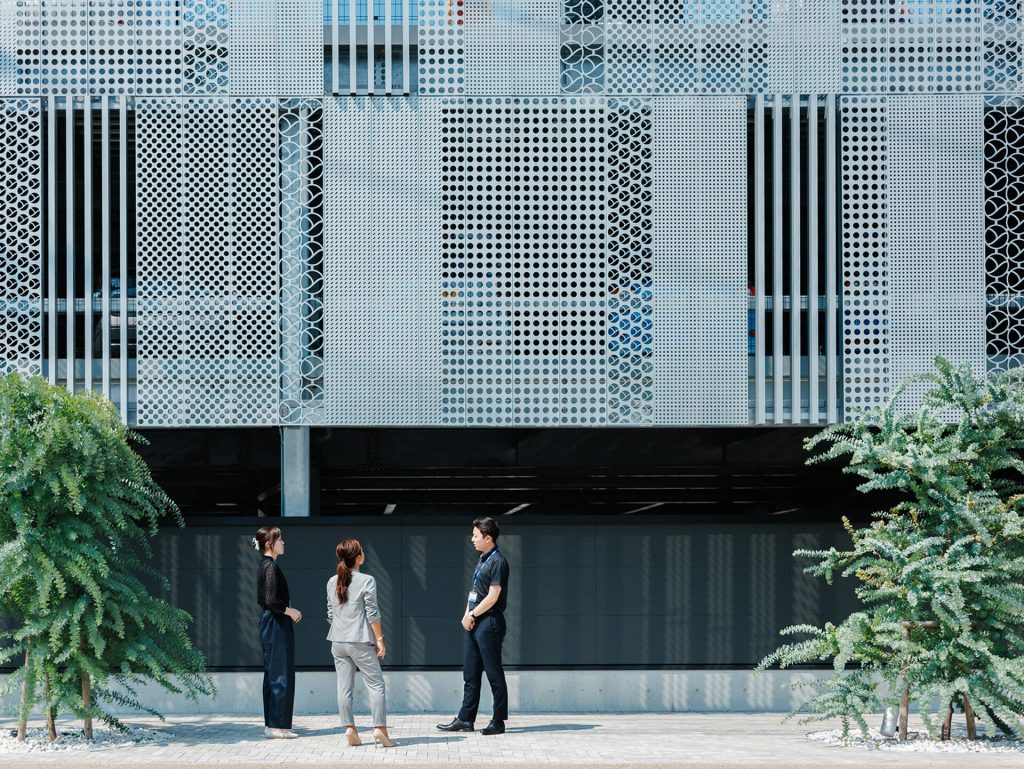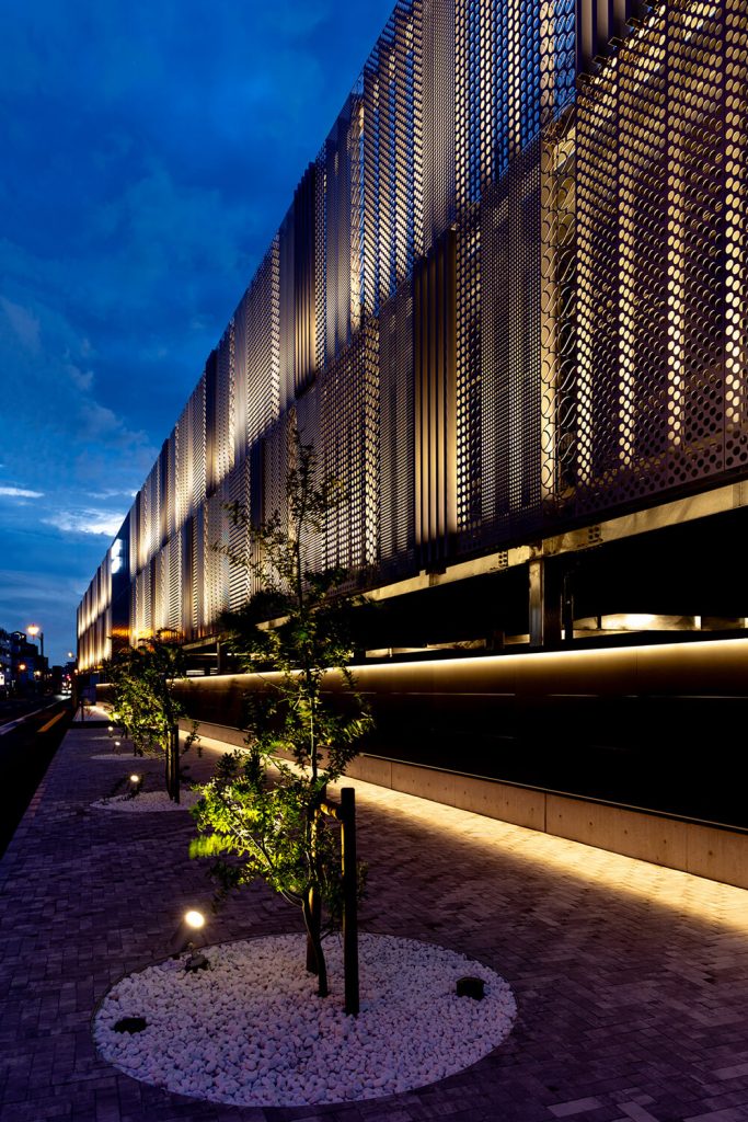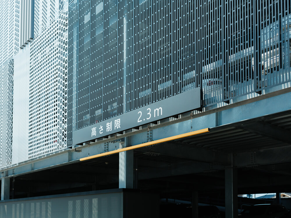 当初は緑化を考えましたが、メンテナンスが大変になることや、駐車場を覆う外装材を不燃材料にしなくてはならないという法上の規制があり、例えば格子壁のような木製のルーバーも使用が制限されます。結局は金属製に落ち着きましたが、少しでも風通し良く、また建物内が明るくなるように、スチール製パンチングパネルを採用しました。