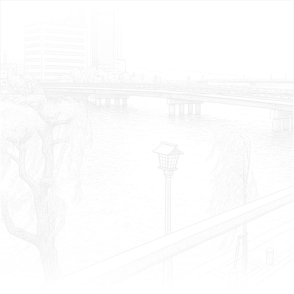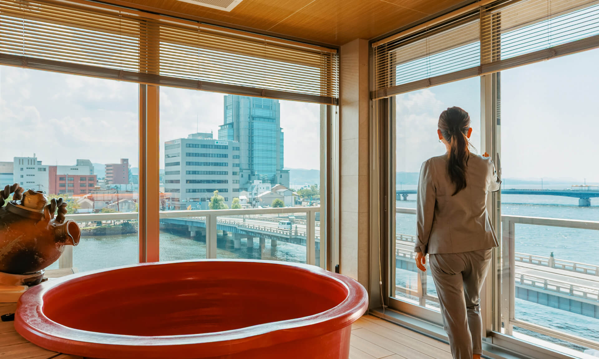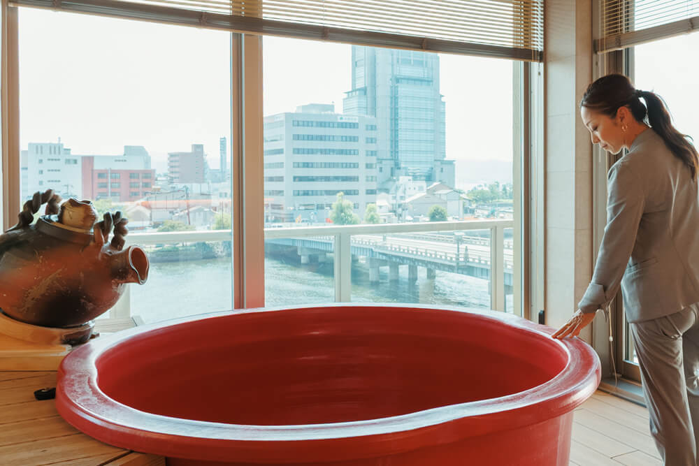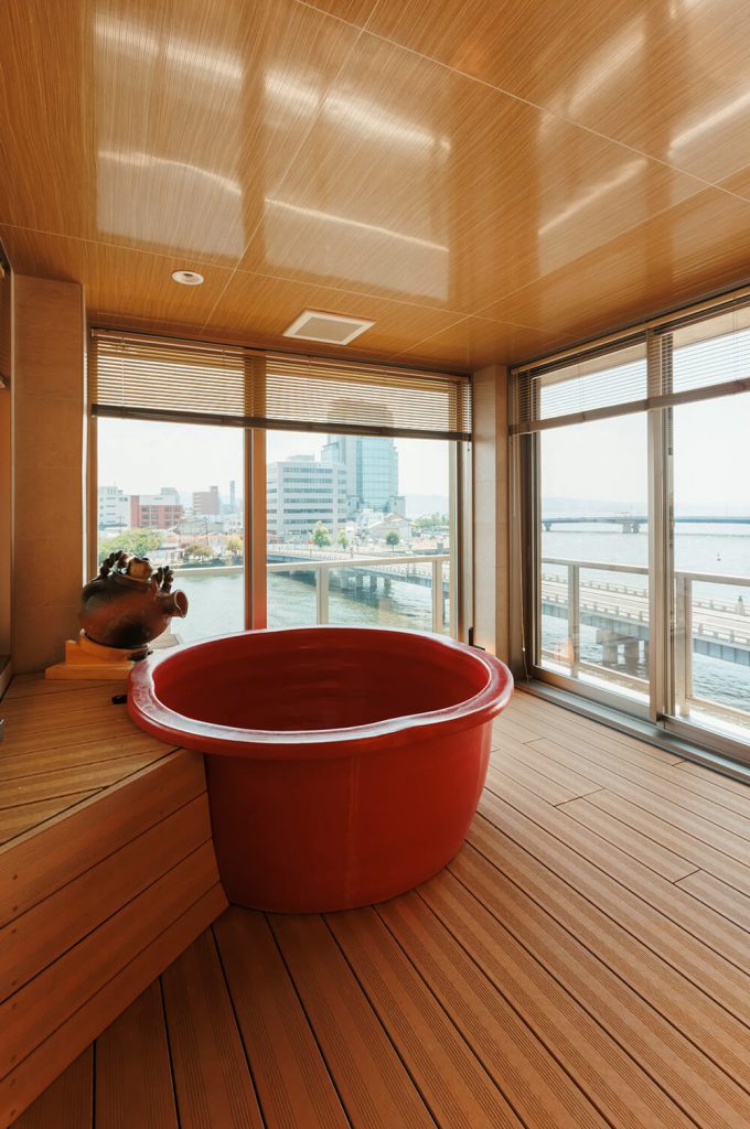 - 小泉八雲が松江の滞在中に宿泊していた「富田屋」ゆかりの旅館として知られる大橋館だけに、「大橋の眺めが引き立つようなリニューアル」という強い要望もあり、特に大橋に近い角部屋「展望温泉風呂付き客室」には、湖畔景色が楽しめる部屋風呂が目玉となるよう、大きな開口面を設計。このガラス面には外からは中が見えない特殊なガラスフィルムが施してあります。ここに設置された丸型の陶器風呂はジェームス氏がこだわって選んだものでもあり、景色とともに浴槽も違和感なく周囲に溶け込むよう、シンプルな空間デザインを心がけました。