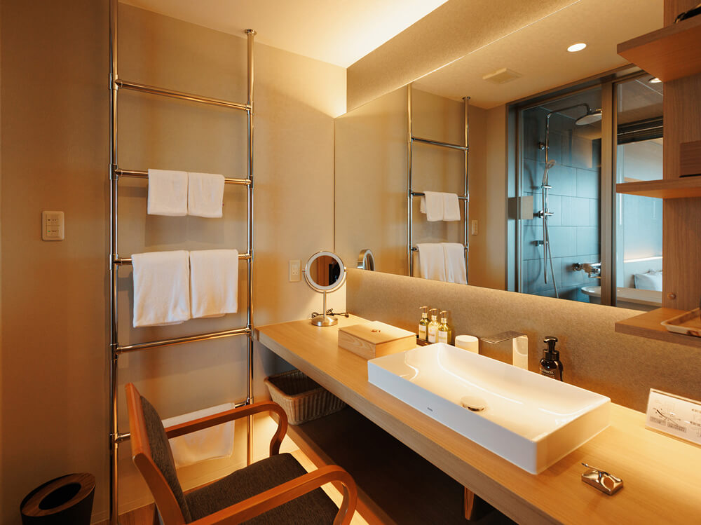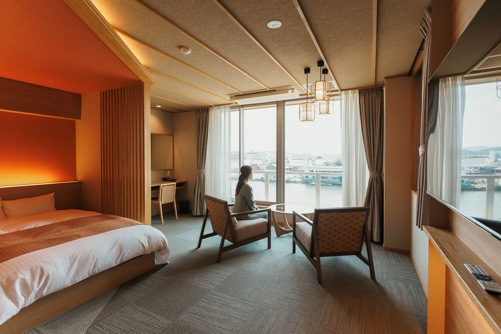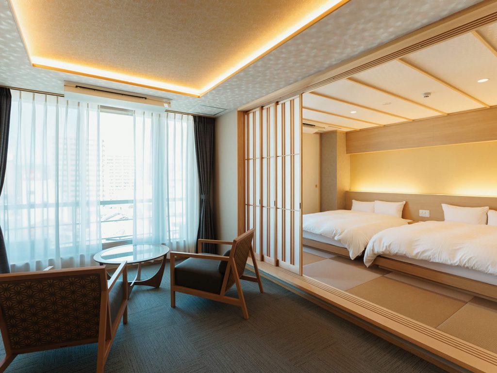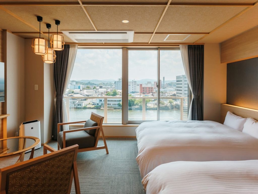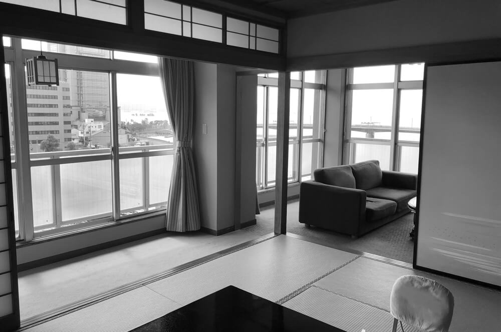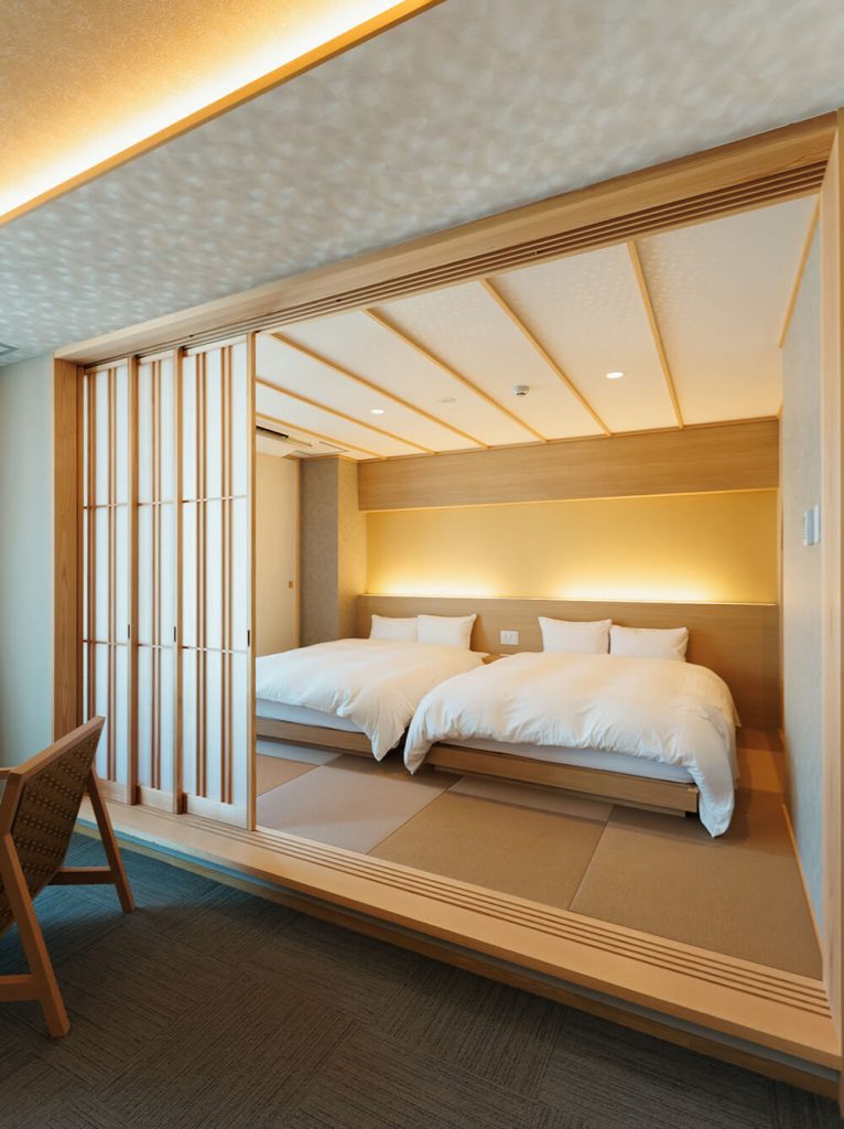 眺望をメインにした大橋川沿いの2部屋に対し、市街地側の客室は外国人宿泊客をメインターゲットに、小上がりの畳コーナーや建具(障子)など、外国人に喜ばれる“和”の雰囲気を前面に出すことで、日本のライフスタイルを手軽に体験してもらえるような宿泊空間をデザインしました。