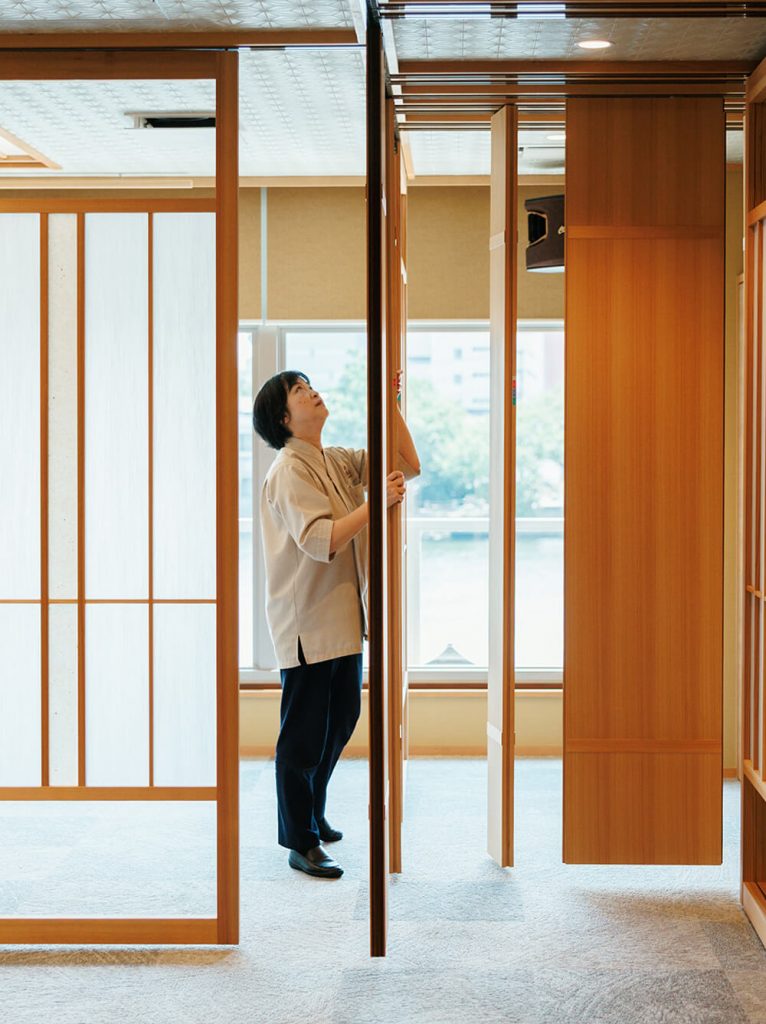 - 従来通りの広い宴会場としてだけでなく、リニューアル後は朝食や小宴会などにも使えるよう、空間の大きさを自由自在に変えたいという要望がありました。そこで天井にレールを敷設し、取り外し自由の可動式パネルをそのレールに吊り下げる方式で、最多で9部屋分まで区切れるように改修しました。パネルのアレンジ自体はすぐに決まりましたが、それよりも、どのように区切っても、その空間が単独で違和感なく成り立つデザインに仕上げることに注力しました。