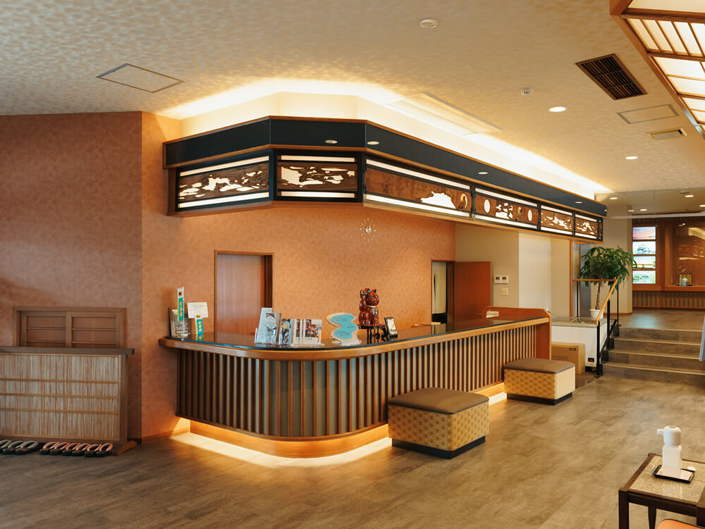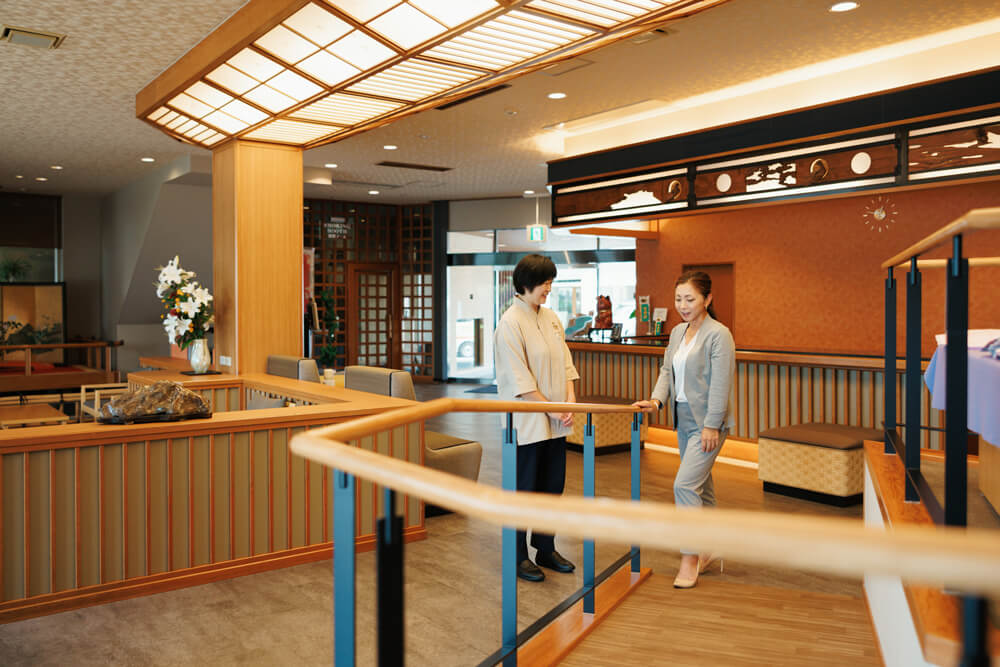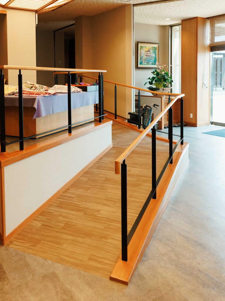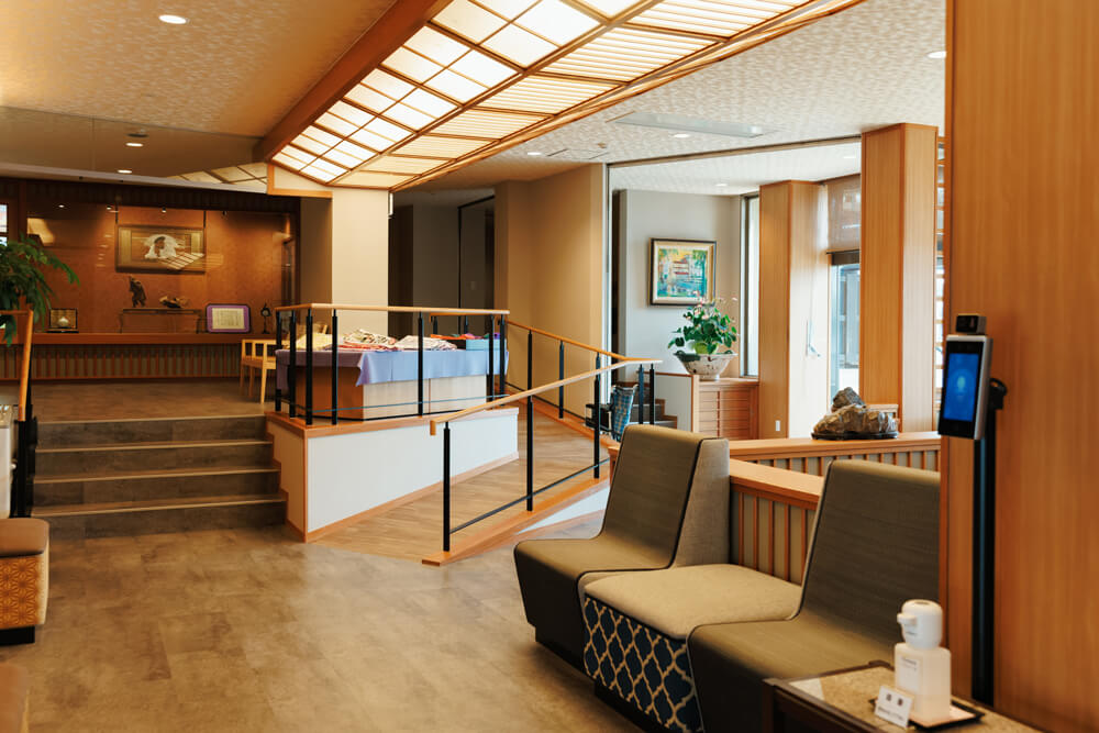 - 改修前のロビーは、フロントからエレベータホールまで階段を利用しなければならないほどの高低差があり、改修はその高低差問題を解消するためのスロープ新設が大きな課題でした。スロープを設けるにあたり、車椅子が自走で上がるためには、5~6メートルという長い距離が必要になります。それを限られたスペースでいかに確保するかで苦心しましたが、最終的には需要の減っていた土産物コーナーを撤廃し、その空いたスペースを活かして、ロビー中央にスロープを配置することに。通常は壁際など目立たない場所に設置されるスロープを空間の中心に計画するという大胆な発想でしたが、こうすることで空間に個性が生まれ、何よりも車椅子の方から大変喜ばれる結果になりました。